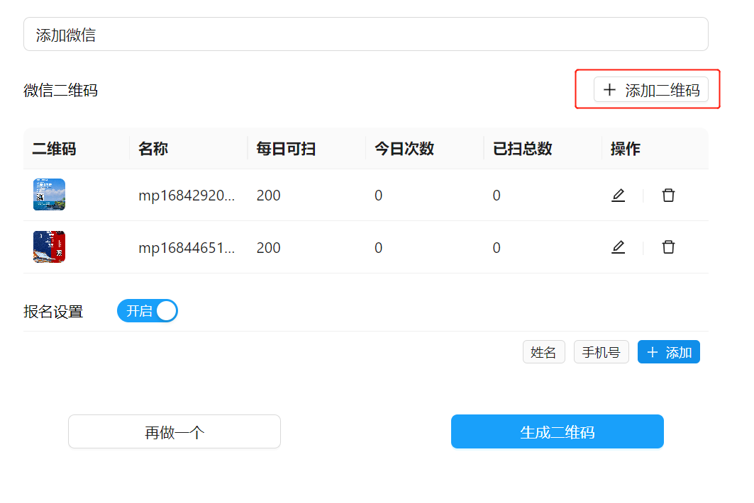 2.点右侧“添加二维码”按钮,上传多个销售的微信二维码,然后“开启报名”就可以了。