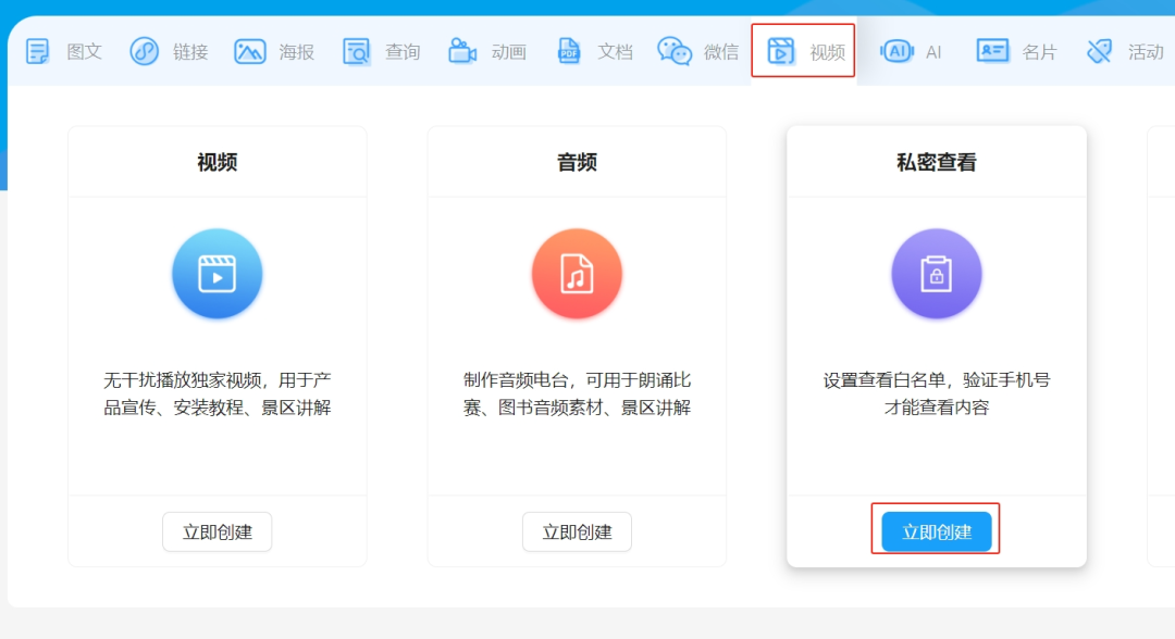 易企微活动二维码生成器里视频、图文、文档功能可以开启“私密查看”功能,可以实现这个需求。支持输入白名单手机号,只有通过手机号验证的才能查看你的视频、文档、图文内容。