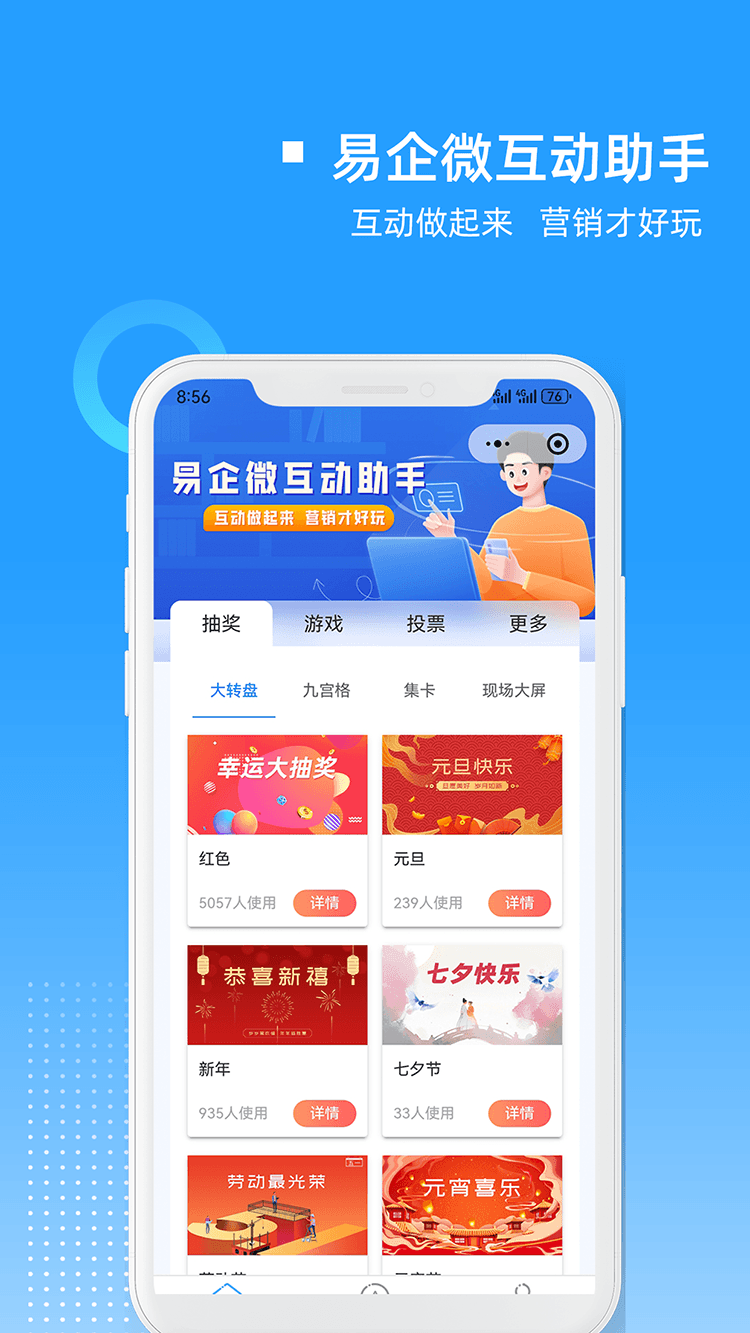 总之,易企微大转盘活动抽奖助手软件是一款功能丰富、操作简便、安全可靠的大转盘抽奖活动管理APP。它能够帮助企业和组织轻松创建和管理抽奖活动,提升品牌知名度,增强用户粘性,实现营销目标。无论您是举办商业推广、节日庆典还是其他类型的活动,这款APP都将是您的得力助手。快来下载体验易企微大转盘活动抽奖助手软件,为您的活动增添更多乐趣和惊喜吧!