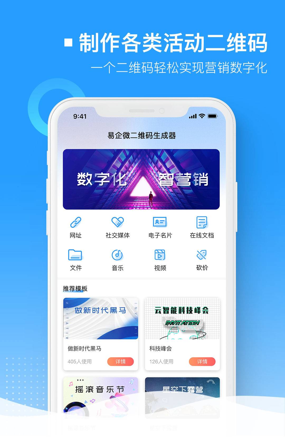 易企微二维码制作是一款全功能二维码生成与管理工具,面向线下门店、教培机构、企事业单位等各类用户,支持普通二维码、智能链接码、活码、文档码、音视频码、名片码、H5动画码等多种类型,同时内置拼团、抽奖、投票等营销活动二维码和分数/分班/工资查询码。